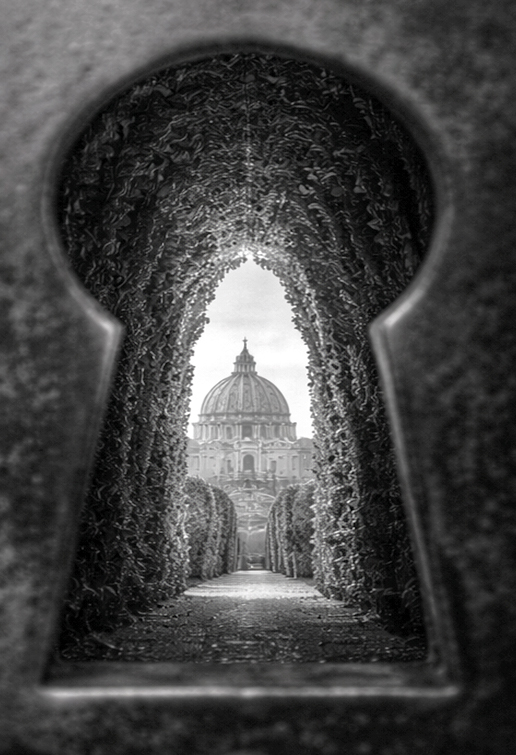 by wejść do pałacu, ale by… zajrzeć przez maleńką dziurkę od klucza w drzwiach. Gdy się przez nią spojrzy, widać coś zachwycającego: kopułę Bazyliki św. Piotra, idealnie wpisaną w zielony tunel ogrodu. To tylko wąski otwór, a jednak odsłania ogromne piękno.